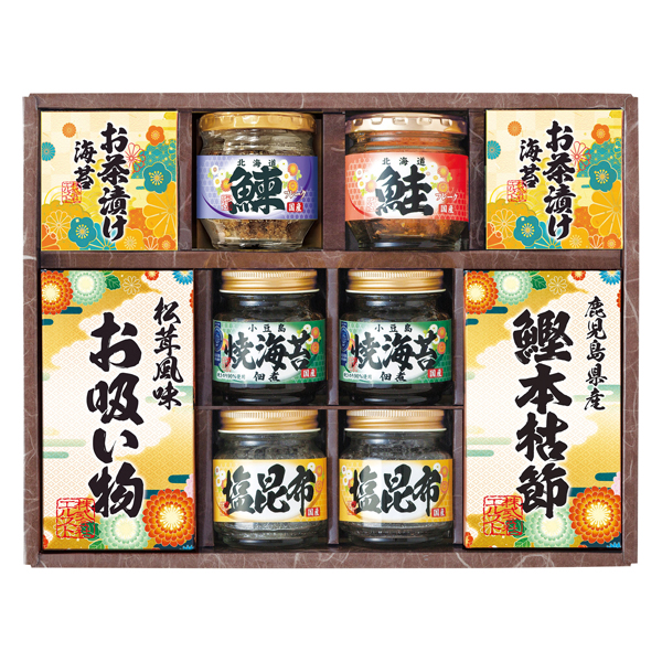 焼きのり入佃煮85g・永谷園お茶づけ海苔(2袋入)・塩昆布18g各2、鰹本枯節(3袋入)・永谷園お吸い物松茸風味(4袋入)鮭フレーク40g・にしんフレーク50g各1