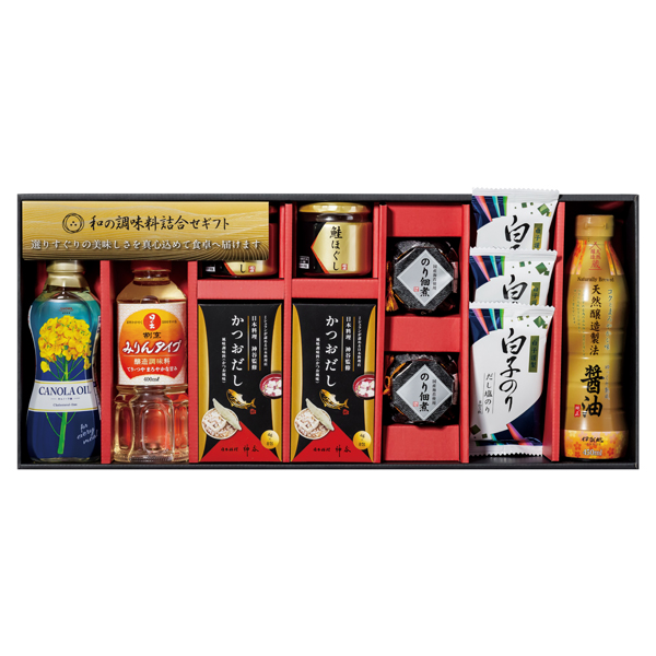 伊賀越天然醸造製法醤油450mL・昭和キャノーラ油300g・日の出割烹みりんタイプ400mL各1、かつおだし(8袋入)・のり佃煮80g・鮭ほぐし50g各2、白子のりだし塩のり(8切5枚)×3