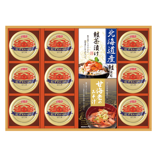 ニッスイ紅ずわいがにほぐし身55g×9 、甘海老みそ汁(3袋入)・北海道産鮭茶漬け(3袋入)各1