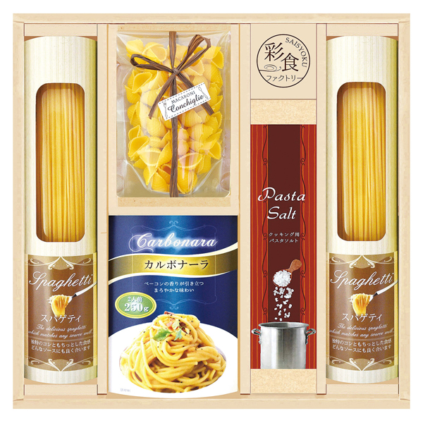 スパゲティ130g×2、パスタソース(カルボナーラ)250g・マカロニ(コンキリエ)70g・パスタソルト100g各1