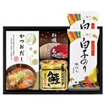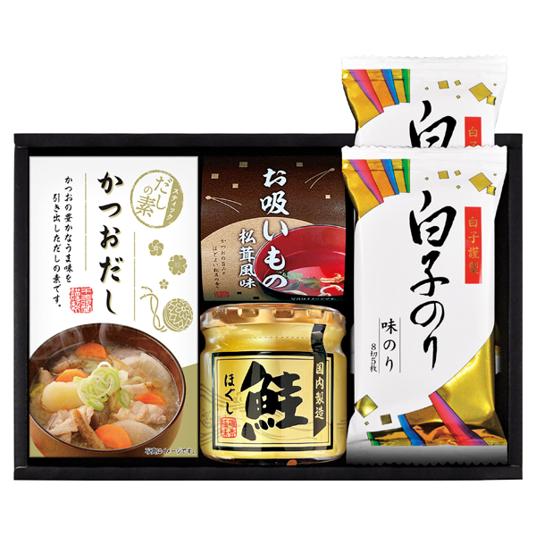 白子のり味のり(8切5枚)×2、鮭ほぐし50g・かね七かつおだし(5袋入)・永谷園お吸いもの(2袋入)各1