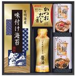有明海産味付け海苔(3切4枚)・梅茶漬け(2袋入)・鮭茶漬け(2袋入)・マルトモかつおだしの素(4袋入)・伊賀越天然醸造しょうゆ200mL各1