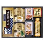 有明海産味付け海苔(3切4枚)・のり玉子ふりかけ(2袋入)・鰹ぶし削り(2袋入)・梅茶漬け(2袋入)・鮭茶漬け(2袋入)・マルトモかつおだしの素(4袋入)・伊賀越天然醸造しょうゆ200mL各1