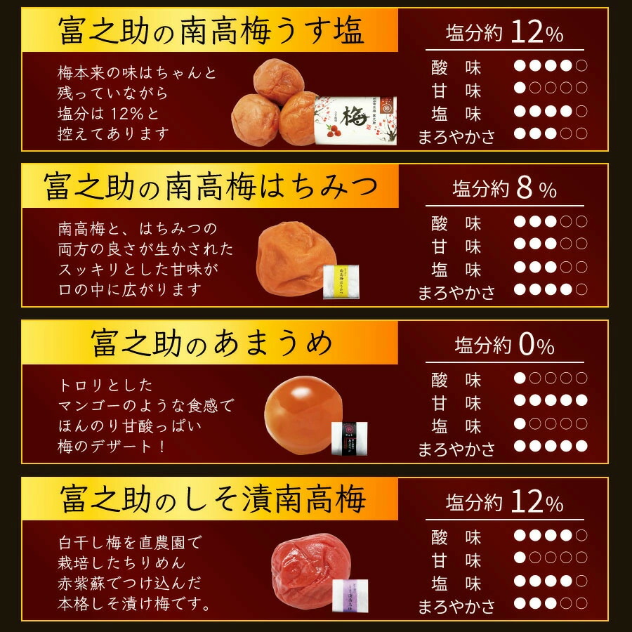 富之助の南高梅はちみつ(8g×2)・富之助のしそ漬南高梅(8g×3)・富之助の南高梅うす塩味(8g×3)・富之助の白干南高梅(8g×3)・富之助のあまうめ(8g×3)・千莉菴の天の梅(8g×6)