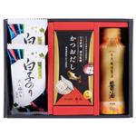 かつおだし(8袋入)・伊賀越天然醸造製法醤油200mL各1、白子のりだし塩のり(8切5枚)×2