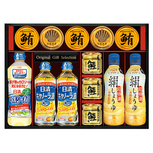 ヤマサ絹しょうゆ450mL×2・まぐろ油漬け70g×3・鮭ほぐし50g×3・日清キャノーラ油400g×2・日清ヘルシーオフ600g・宝幸貝柱水煮ほぐし身65g×2 【小麦】