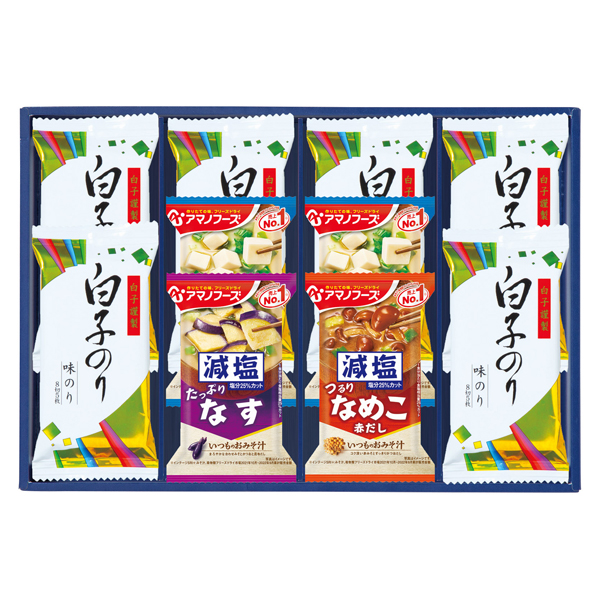 白子のり味のり(8切5枚)×6、減塩いつものおみそ汁(とうふ×2、なす・なめこ各1)