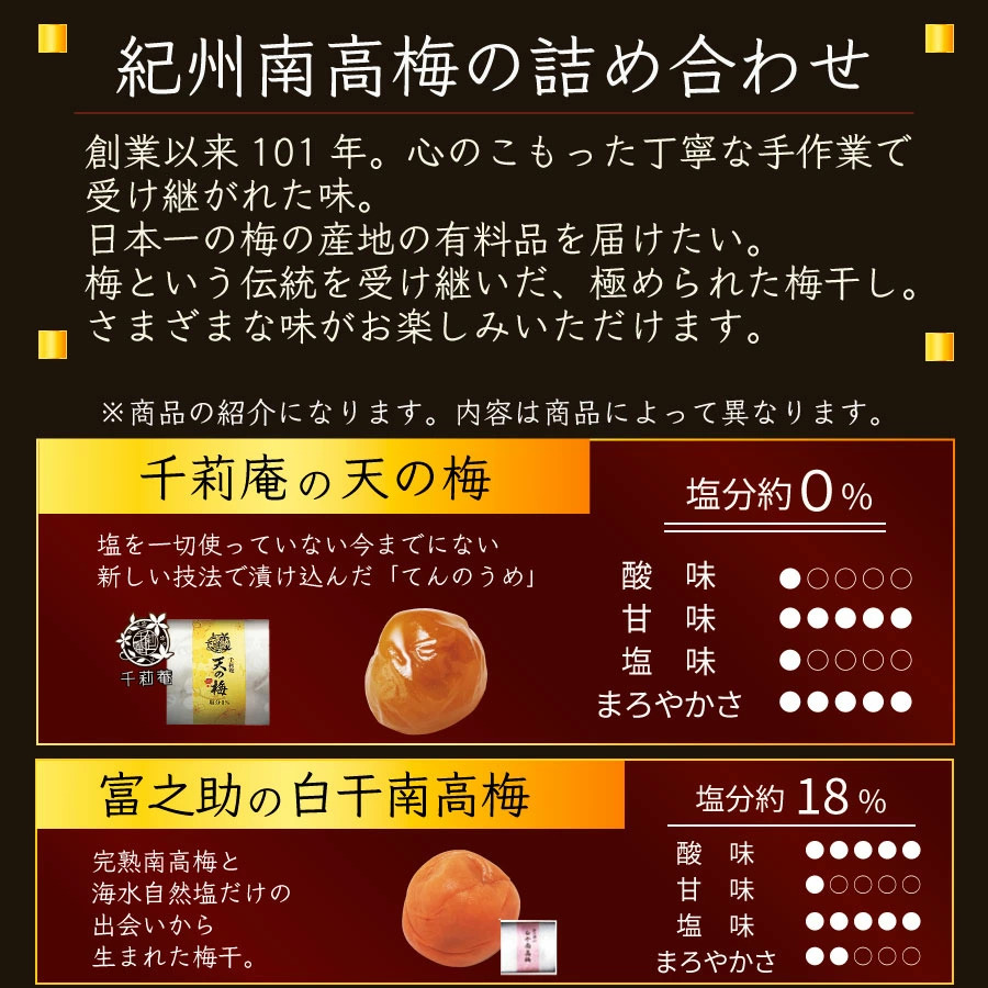 <和歌山県優良県産品推奨>創業以来101年。心こもった丁寧な手作業で受け継がれた味。良質の梅干を作るには、旬の完熟梅を塩漬けすることから始まります。完熟の梅は出来るだけ早く選別し、水洗いして塩になじませます。その塩をいかに早く梅に浸透させるか、この時にこまめに塩をまいて梅になじませる事、これが最も大事な作業です。この伝統を受け継ぎ極められた梅干に、塩を一切使わない、今までにない新しい技法で漬け込んだ「天の梅」、「あまうめ」が加わり、新しい梅の魅力をさらに引き出しています。心に残るおいしい梅干をお届けします。