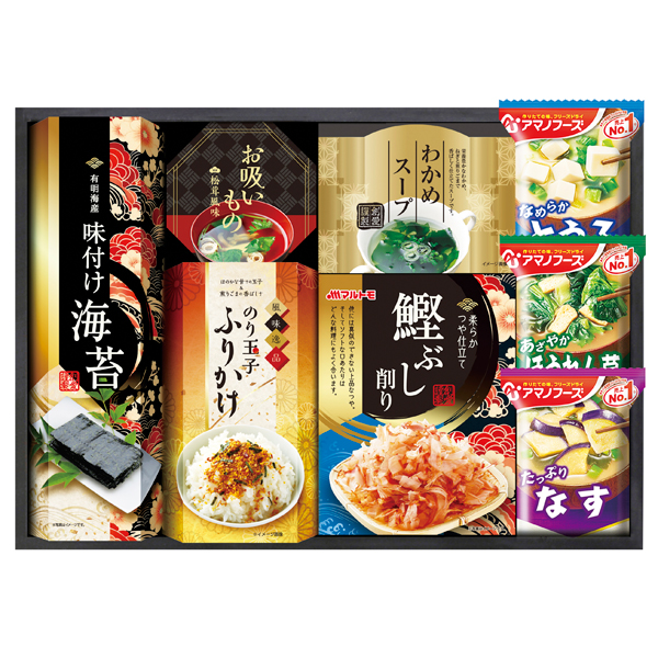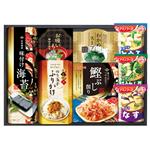 有明海産味付海苔(8切4枚×2袋)・永谷園お吸いもの松茸風味(2.3g×2袋)・のり玉子ふりかけ(4.5g×2袋)・わかめスープ(5.3g×2袋)・アマノおみそ汁(とうふ・ほうれん草・なす)・マルトモ鰹ぶし削り(2g×4袋) 【卵・乳成分・小麦・えび】