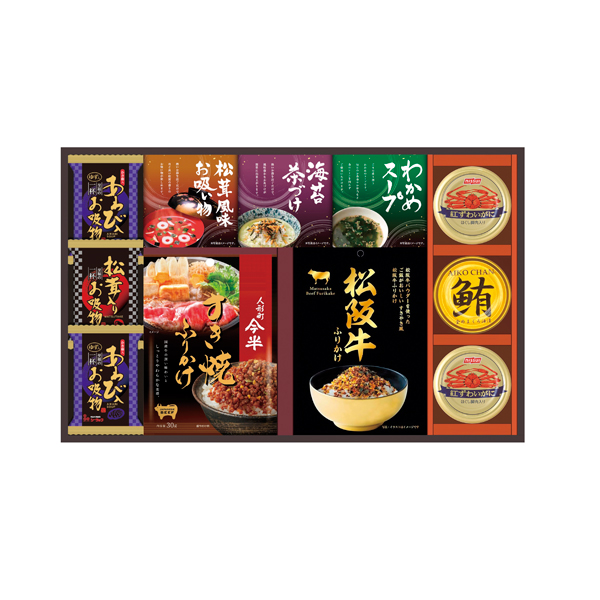 人形町今半すき焼きふりかけ30g・松阪牛ふりかけ30g・紅ずわいがにほぐし身55g×2・鮪油漬けフレーク70g・丸美屋のり茶漬け(6g×2袋)・永谷園松茸風味お吸い物(2.3g×2袋)・わかめスープ(3.5g×3袋)・お吸い物(あわび入×2・松茸入り) 【卵・乳成分・小麦・かに】