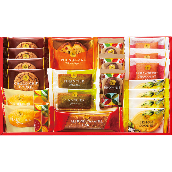 ブラウンシュガーパウンドケーキ、アーモンドキャラメルケーキ、(オレンジマドレーヌ・ピスタチオフィナンシェ)各2、(ストロベリーショコラケーキ・ブラウニー)各3、(チョコチップクッキー・レモンクッキー)各4 【卵・乳成分・小麦】