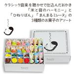 クラシック音楽を聴かせて仕込んだおかき「米と音のハーモニー」と、あっさり塩味とコクのあるカレー味のひねり揚げ「ひねりんぽん」、なつかしい味のミレーフライ「まんまるミレーヌ」の3種類のお菓子のアソートです。