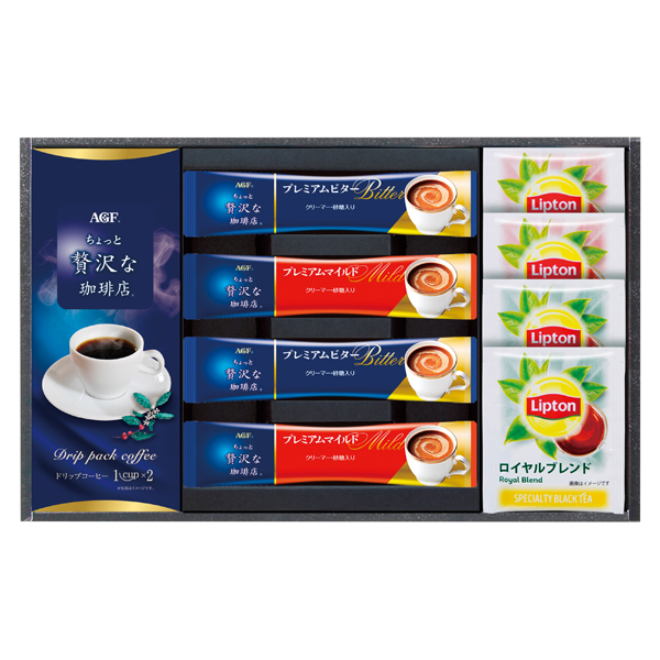 AGFちょっと贅沢な珈琲店(スペシャルブレンド7g・プレミアムマイルド・プレミアムビター各2)、リプトンティーバッグ(ロイヤルブレンド・セイロン各2)