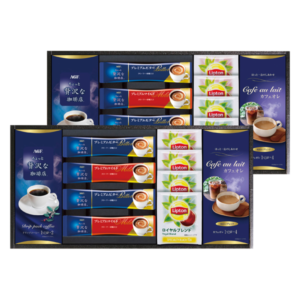 AGFちょっと贅沢な珈琲店(スペシャルブレンド7g・プレミアムビター・プレミアムマイルド各4)、リプトン ティーバッグ(ロイヤルブレンド・セイロン各4)、カフェオレ(4袋入)×2