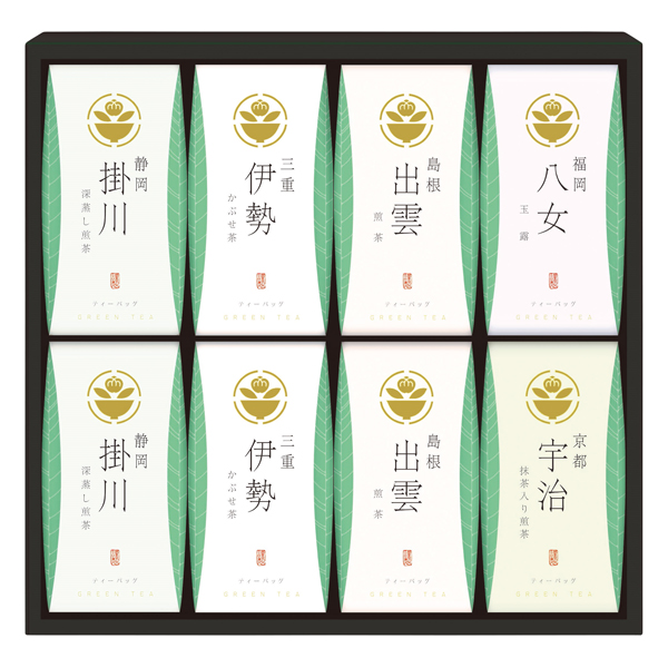 静岡 掛川深蒸し煎茶ティーバッグ(5袋)・三重 伊勢かぶせ茶ティーバッグ(5袋)・島根 出雲煎茶ティーバッグ(5袋)各2・京都 宇治抹茶入煎茶ティーバッグ(5袋)・福岡 八女玉露ティーバッグ(5袋)各1