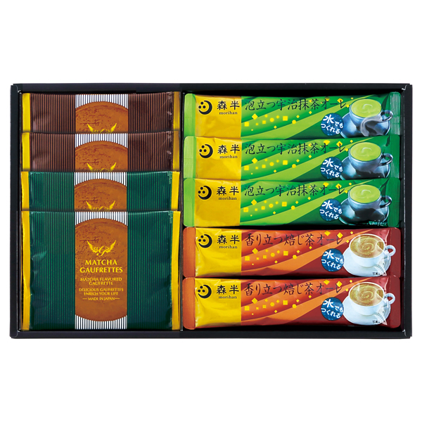 宇治抹茶オーレ10g×3、焙じ茶オーレ10g×2、ゴーフレット(チョコクリーム・抹茶クリーム各2)