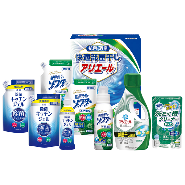 生乾き臭・カビ臭にWで効く部屋干し用のアリエールジェルと本格消臭の抗菌部屋干しソフター、食器洗剤除菌キッチンジェルが入ったクリーンギフトです。