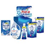 抗菌洗剤アリエールと、少量でたくさん洗える濃縮タイプの食器洗剤除菌ジェル、室内干しのイヤなニオイを防ぎ、ふっくら柔らかく仕上がる抗菌・消臭ソフターのギフトです。