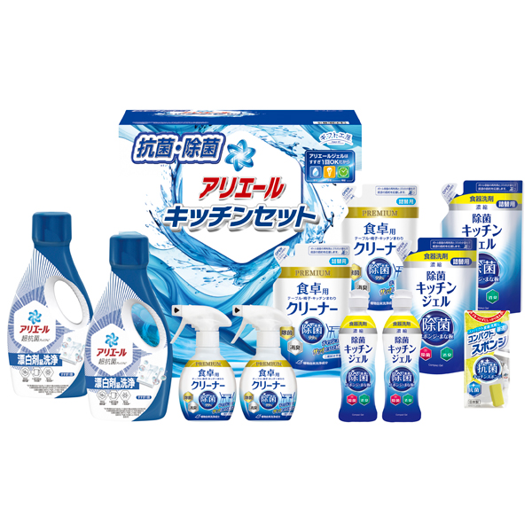 アリエールジェル700g×2・除菌キッチンジェル(本体200mL×2・詰替160mL×2)・食卓用クリーナー(本体260mL×2・詰替250mL×2)・コンパクトスポンジ